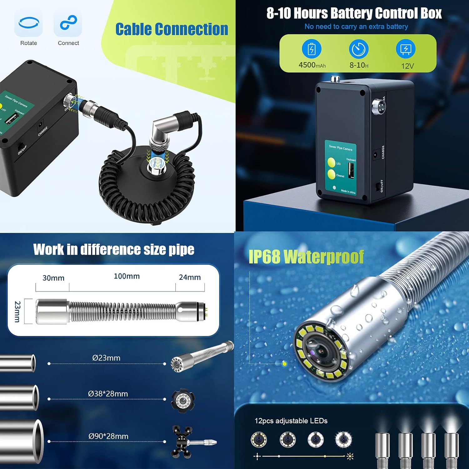 2023 sewer camera is suitable for sewer pipe blockage, wall inspection, home maintenance, industrial maintenance, industrial plumbing system, building inspection, railway inspection, municipal work, etc. Item: parameter -Monitor:10.1 inch IPS color record monitor -Function:Video record/audio/photo/electronic zoom/power display/ meter counter/keyboard input (support English) -TF Card: Memory Support maximum 128G SD card(16G SD card included) -512hz:Built in 512hz transmitter -Camera :Auto Self Leveling AHD 1080P -Camera : AHD 1080P -Charger: AC100-240V DC12.6V -Battery: Luminal-cell arrester 4.5AH -continuous use time for battery: approximate 8h -material: fiber tube with /high intensity -camera light source: 12 PCS LED with high while light(adjustable) -camera viewing angle: 145° -Lens?Mirror?Material?:?Sapphire -camera size/material: 23 millimetre* 40MM /stainless steel -camera protective cover parts size/material:38MM* 28MM /plastic-steel -camera protective cover parts size/material:90MM* 28MM /plastic-steel with wheel Package List: 1 *10.1inch IPS Monitor(DVR) 1 * Camera (Built in 512hz transmitter Auto Self Leveling ) 1 * 16GB TF Card 1 * 20M Fiberglass Cable 2 * Camera Proof Cover 1 * 4500mah Battery Box 2 * Charger 1 * Connection Cable 1 * Screw Driver 1 * User Manual (English)
