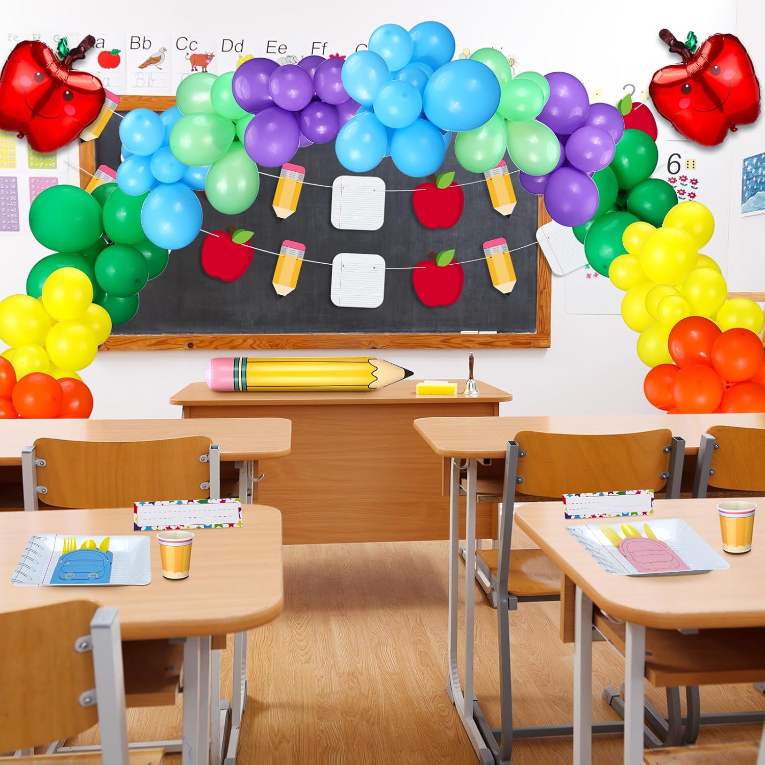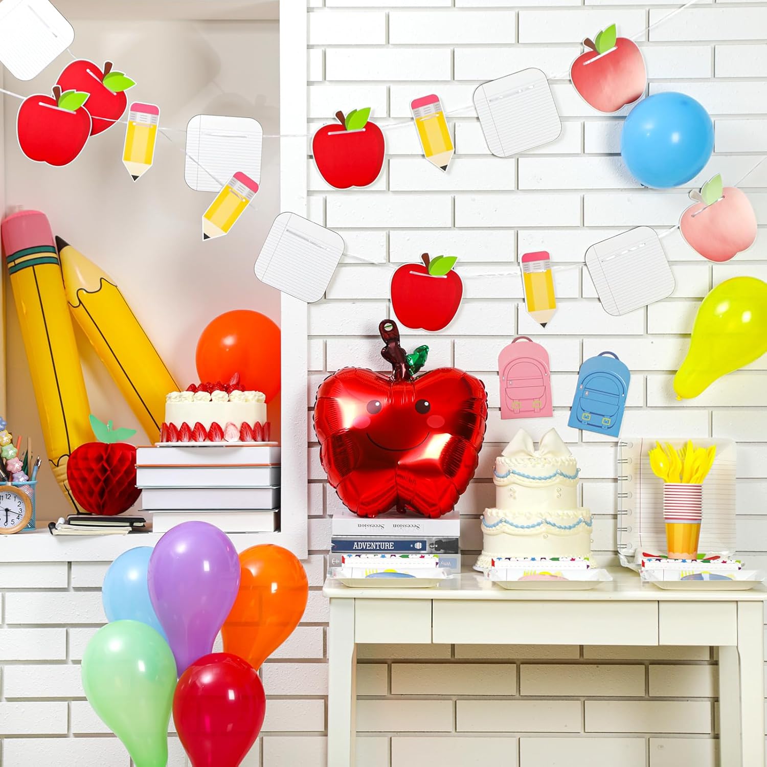 Included Components 12 x Notebook plates, 24 x Napkins, 12 x Cups, 12 x Yellow knives, 12 x Yellow forks, 12 x Yellow spoons, 12 x Cutlery holders, 6 x Apple honeycomb decorations, 2 x Pencil apple notebooks banners, 3 x Apple balloons, 3 x Pencil balloons, 12 x Name tags, 100 x Rainbow mixed color balloons