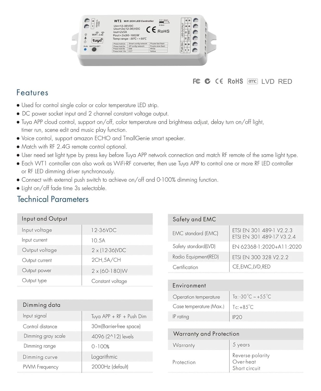 ControllersDimmersTechnical parameters: Input voltage: DC12V 24V 36VInput current: 10.5AOutput voltage: 2×(12-36)VDCOutput current: 2CH 5A/CHOutput power: 2×(60-180)WOutput type: Constant voltageControl distance: 30m (barrier-free space)Dimming grayscale: 4096 (2^12) levelsDimming range: 0-100%Dimming curve: logarithmicPWM frequency: 2000Hz (default)Applicable to 5050/5630/3528/Cob light stripsPacking: As per your choice
