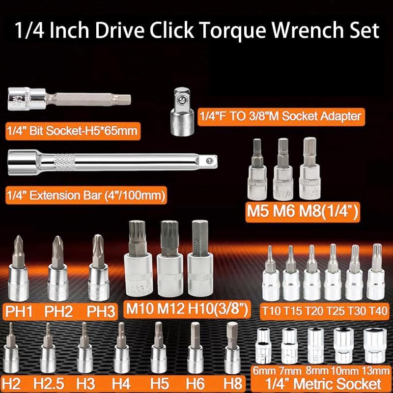32-Piece Torque Wrench Set – Built for American MechanicsGet professional torque control in your garage. This 32-piece 1/4" drive click torque wrench set delivers 3.7-18.5 ft.lb (5-25 Nm) dual-scale accuracy within ±3%, backed by a calibration certificate. The 72-tooth CR-V steel ratchet operates smoothly in tight spaces and works in both directions for versatile use.The loud click and vibration alert ensure you never over-torque, protecting engine threads and carbon components.This set is packed with pro-level extras: magnetic spark plug sockets (14mm & 16mm), Torx bits (T20, T30, T40), a 3/8" extension bar, and a universal joint—all stored in a rugged, portable case.Built for motorcycles, cars, ATVs, snowblowers, and small engines, it’s the reliable torque solution for DIYers and weekend mechanics who demand precision and durability.