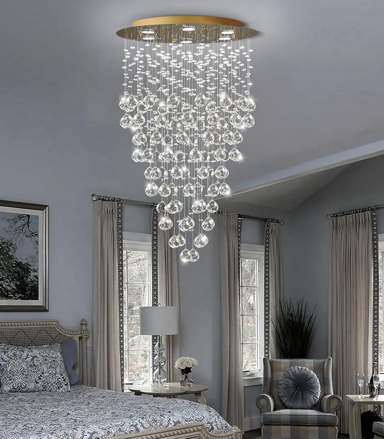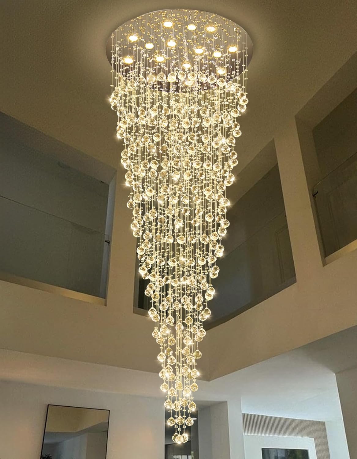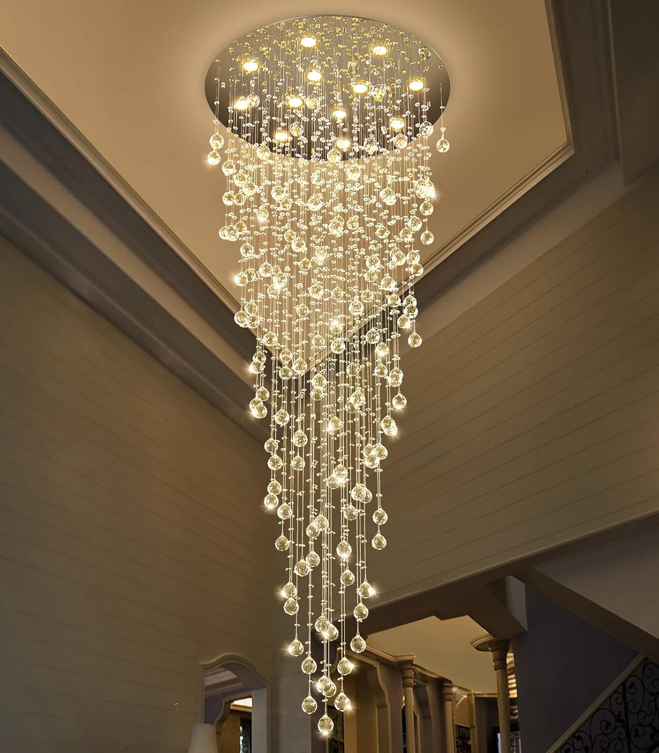 36'' Modern Crystal Chandelier for Entryway Raindrop Chandeliers LED Dimmable High Ceiling Flush Mount Light Fixtures for Staircaes Hallway Foyer Living Room LED Bulbs Included Gold