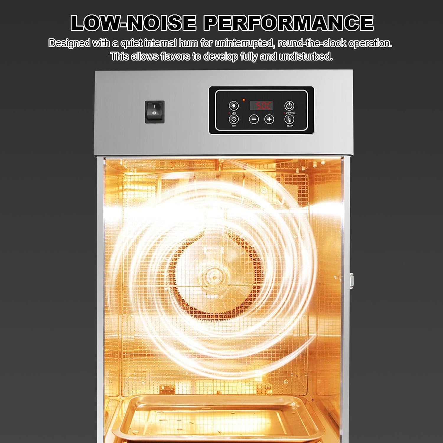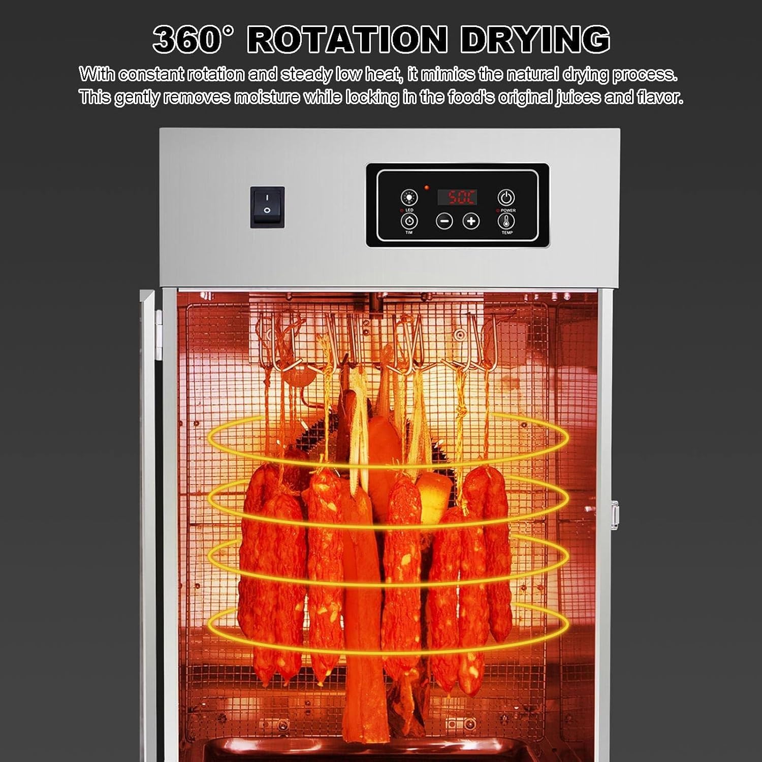 Introducing our stainless steel meat curing chamber, a professional-grade meat dryer designed for culinary enthusiasts and chefs. This versatile appliance is perfect for crafting your favorite dried goods, including sausages, bacon, chicken, duck, fish, and beef. **Key Features:** - **Homemade Delicacies:** Enjoy the rich flavors of homemade dried meats while extending their shelf life, ensuring you can savor your creations longer. - **User-Friendly Design:** Our food dryer is engineered for convenience, allowing you to effortlessly explore the joys of drying food while promoting healthier eating habits without sacrificing taste. - **Even Heat Distribution:** The innovative heat distribution design ensures that your food dries evenly, eliminating the need for rotating trays and providing consistent results every time. - **Advanced Air Circulation:** Equipped with a rear-mounted drying fan and air circulation technology, this electric dryer guarantees even heating, enhancing the quality of your dried foods. **Specifications:** - **Product Name:** Rotary Meat Dryer - **Material:** Stainless Steel - **Voltage:** 110V/220V - **Power:** 800W - **Timer:** 14 Hours - **Control:** Digital Control - **Temperature Range:** 30-90°C - **Product Dimensions:** 34×40×55.5cm - **Weight:** 16kg **Package Includes:** - Rotary Meat Dryer *1 Transform your kitchen into a gourmet meat curing station with our stainless steel meat curing chamber. Enjoy the satisfaction of creating delicious, healthy snacks that are sure to impress your family and friends.