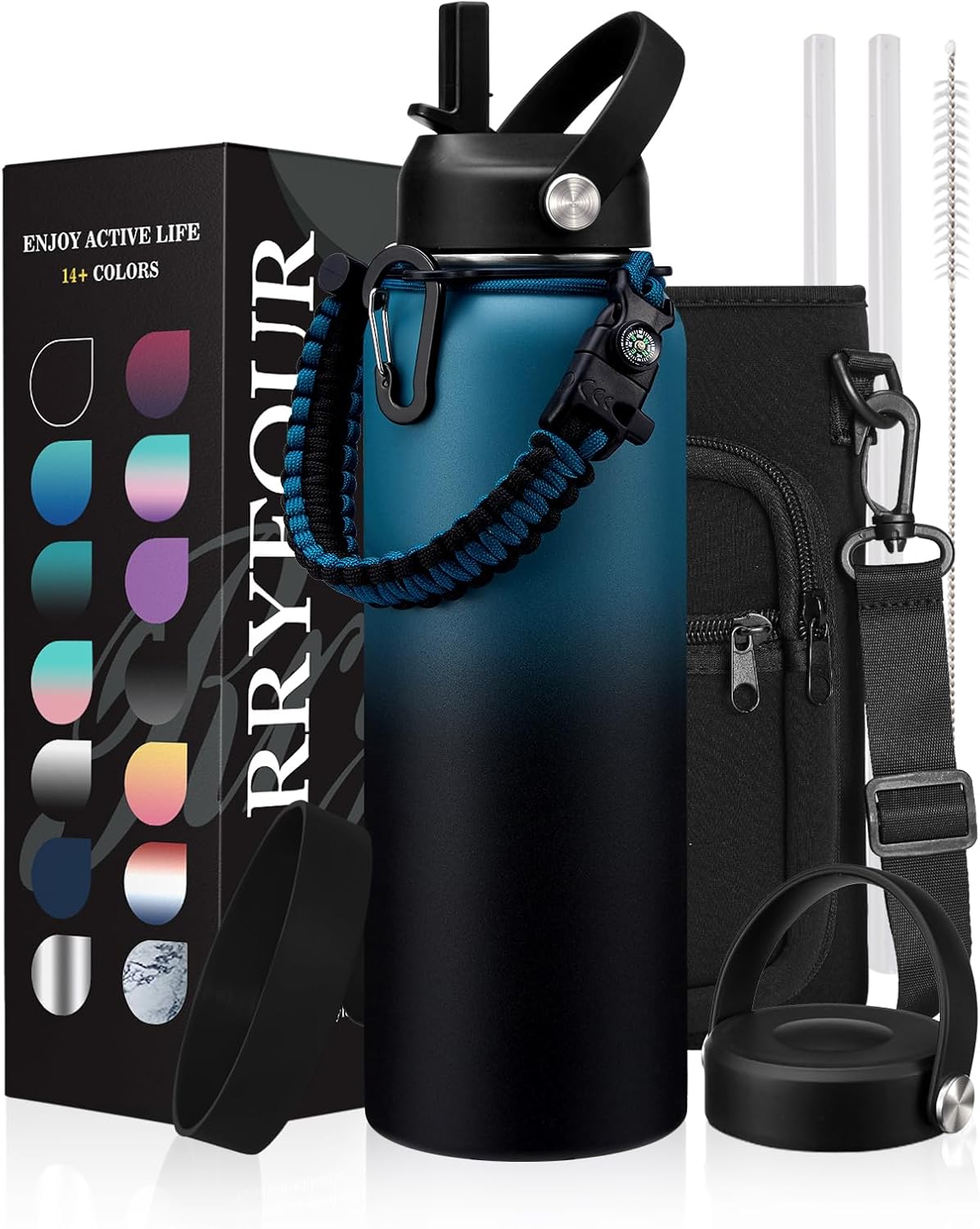 RRYFOUR water bottle is equipped with straw, paracord handle, flex cap, bottle holder with strap & silicone cup mat. Flexible paracord handle, cross body carrier bag with adjustable strap allow free-hands carrying.Double wall vacuum insulation & dipped in copper makes it sweat-free, and keeps beverages cold for 48 hours & hot for 24 hours.