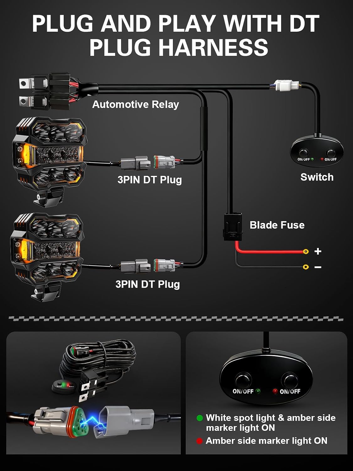 | Additional Features | 4.5 inch cube spotlight flood beam, LED work light offroad driving, amber white combo pod light, auxiliary fog lamp truck tractor boat, waterproof DT connector LED lamp |