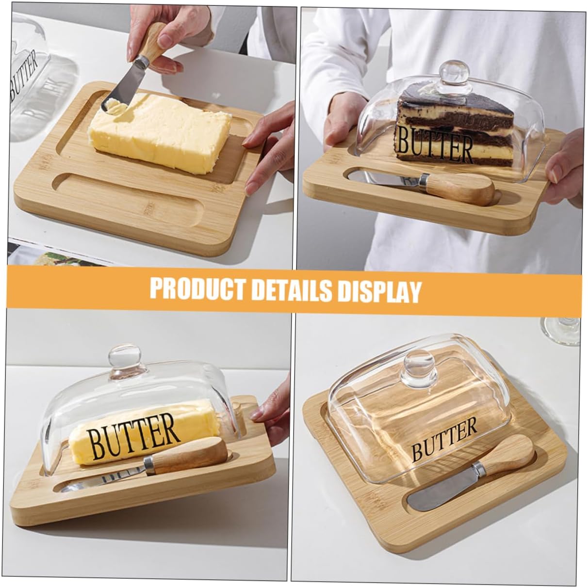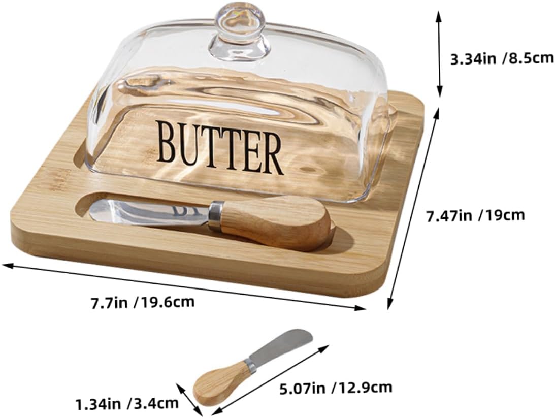 Package List 1 x butter tray 1 x dome 1 x cutter Characteristics -Color:Transparent household storage tableware -Size:19.60X19.00X8.50cm/7.70X7.47X3.34in cheese dish -Size:12.90X3.40X2.00cm/5.07X1.34X0.79in home butter box -Material:Wood, glass, stainless steel butter preservation dish - The Butter Box is large enough to fit various shapes of butter sticks. A great tool for slicing and storing butter butter dish with dome. - The sealed lid keeps butter in the refrigerator without mixing other foods’ taste transparent butter container. - Our Butter Box used for cutting butter storage, and can also be stored in the refrigerator for easily cooking and dining butter dish container. - Suitable for restaurant, dessert shop, kitchen, use it yourself, or present it to your friends as a storage dish. - Big enough to slice butter, easy to use and wash with elegant design bring you a mood and enjoy delicious food butter container for fridge.Goods Descriptionbutter case with lid This item a Butter Box with Cutter which is manufactured with material, classic and delicate.transparent butter container Great for home kitchen or freezer using.butter storage dish Safe to use, stylish and creative.household storage tableware With decor, add luxury and chic atmosphere