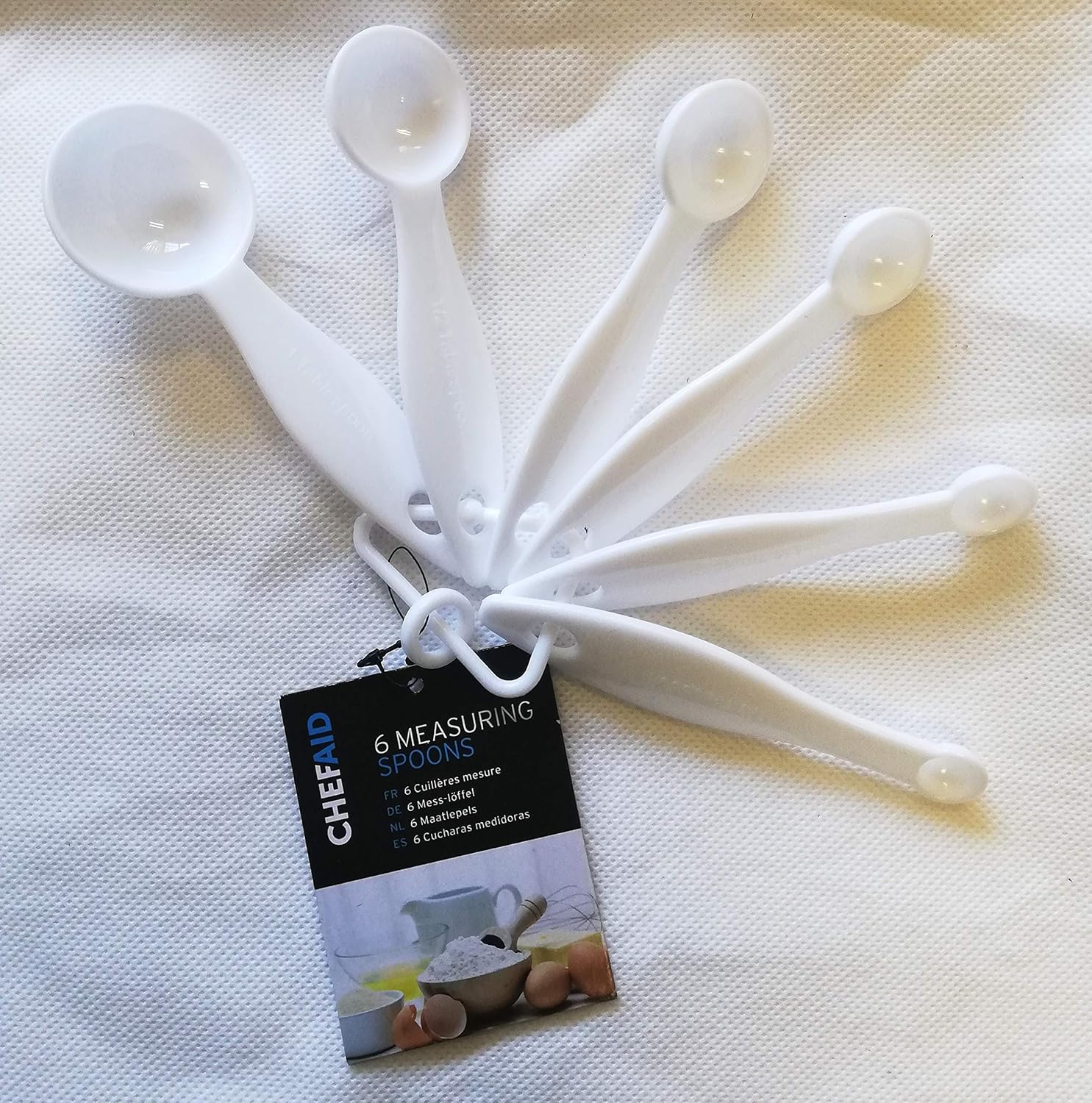 Chef Aid Measuring Spoon is made from plastic. Set contain 1 each of 15 ml, 5ml, 2.5 ml and 1.25 ml tablespoon. Available in white colour. Weighs 24 grams.