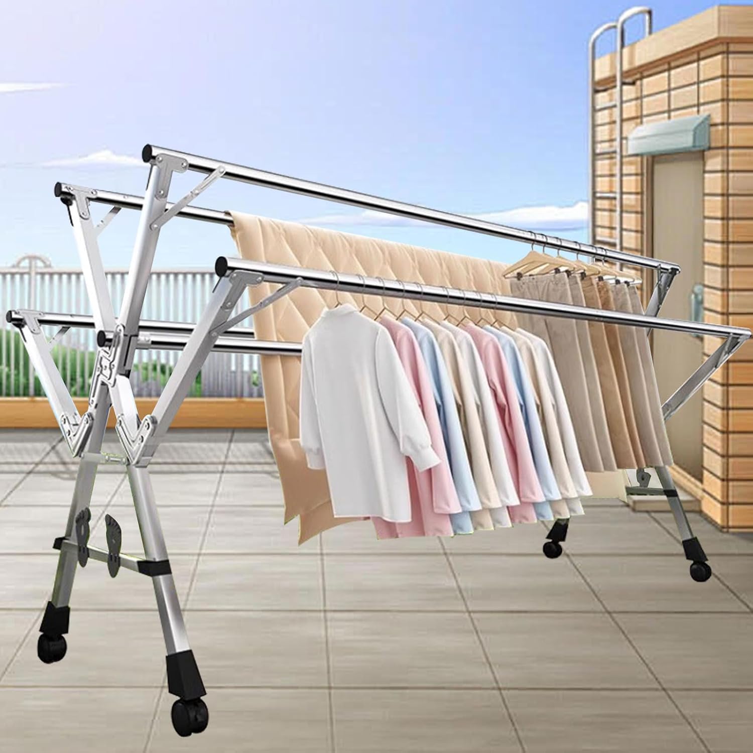 The Clothes Drying Rack is the all-in-one solution for drying your clothes both indoors and outdoors. You can easily dry your clothes, laundry, and other items effectively. Feature: Can hang a lot of clothes for easy storage. Easy to open and close, retractable length, does not take up space after closing. Very long service life, can be reused, and has a strong carrying capacity. Package Contents: 1* Drying Rack 20*Windproof Hook Specifications: Material: Steel Product Size: 120-160cm(47-63in),135-200cm(53-79in),150-240cm(59-94in) Folded Size: 150x10x10cm(59x4x4in) Product Weight: 13-15 lb (6-7 kg) Max Static Load Capacity: 160 lb (75 kg) Kind tips 1.Please distribute the weight of your clothes evenly on the rack to maintain balance. 2.Ensure that the drying rack is placed on a level surface before use. Otherwise, it may fall over, which could cause injury or damage to the product. 3.Some customers reflect that “the rack is supposed to be two parallel bars and they are assembled criss crossed”. There is no problem. You could hold one end of the beam and rotate the other end 180 degrees. Then you can make the beam be parallel. And you could pull the bracket.