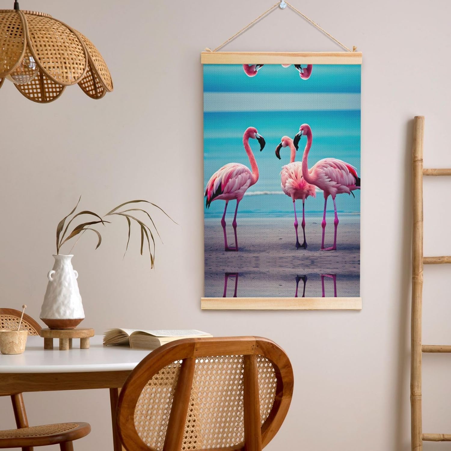 Our Flamingo Beach Print Wooden Poster Hanger Is An Excellent Addition To Your Home Decor Or A Perfect Gift For Friends And Family. Made Of Selected Quality Canvas With Brilliant And Enduring Colors, This Wall Art Is Designed To Resist Water, Dust, And Fading, Ensuring The Bright And Vibrant Art Lasts. The Polyester Is Enclosed Between Two Teak Wood Hanger Scrolls With An Attached 35cm Rope For Easy Hanging. Installation Is Made Simple With The Included Two Nails In A Plastic Box. The Modern Minimalist Style Of Our Wall Hanging Complements Any Home Decor, Elevating The Artistic Ambiance And Brightening Up The Room. Experience The Elegant Transformation This Wall Hanging Scroll Painting Brings To Your Spaces Today.