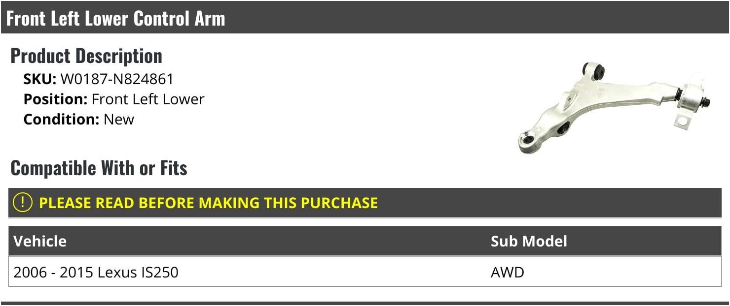 Front Left Lower Control Arm - Compatible with 2006 - 2015 IS250 AWDPosition: Front Left LowerCompatible With or Fits: - 2006 - 2015 IS250 AWD