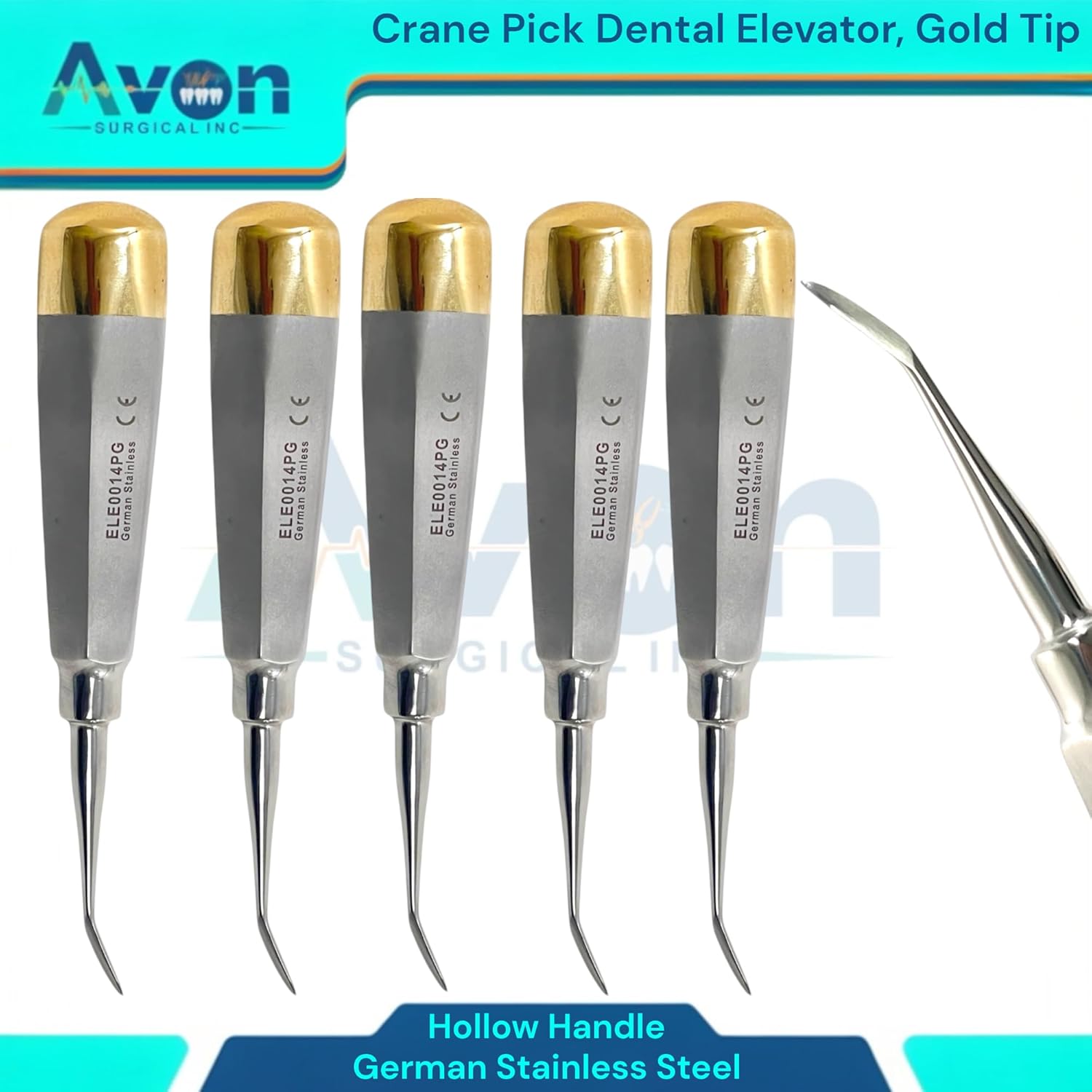 Includes: (Choose Quantity) - Crane Pick Dental Elevator, Slight Bent Tip, Gold End Hollow Handle - German Stainless Steel. Crane Pick Tip Design: The unique crane pick tip is specifically designed to provide optimal access and leverage during tooth extractions. Its fine, tapered shape allows for precise engagement of the periodontal ligament, minimizing trauma to surrounding tissues. The design facilitates effective luxation and removal of teeth, even in difficult or impacted cases. German Stainless Steel: The elevator is manufactured from German Stainless Steel, known for its superior strength, corrosion resistance, longevity, smooth surface, and non-porous nature, facilitating easy cleaning and preventing bacterial buildup. Gold End Hollow Handle Design: The hollow handle design significantly reduces the overall weight of the elevator, minimizing hand fatigue during prolonged use, enhancing tactile sensitivity for improved control and precision, and providing an ergonomic shape for a comfortable and secure grip, reducing hand strain and improving maneuverability. The gold handle enhances visibility and adds a touch of sophistication.