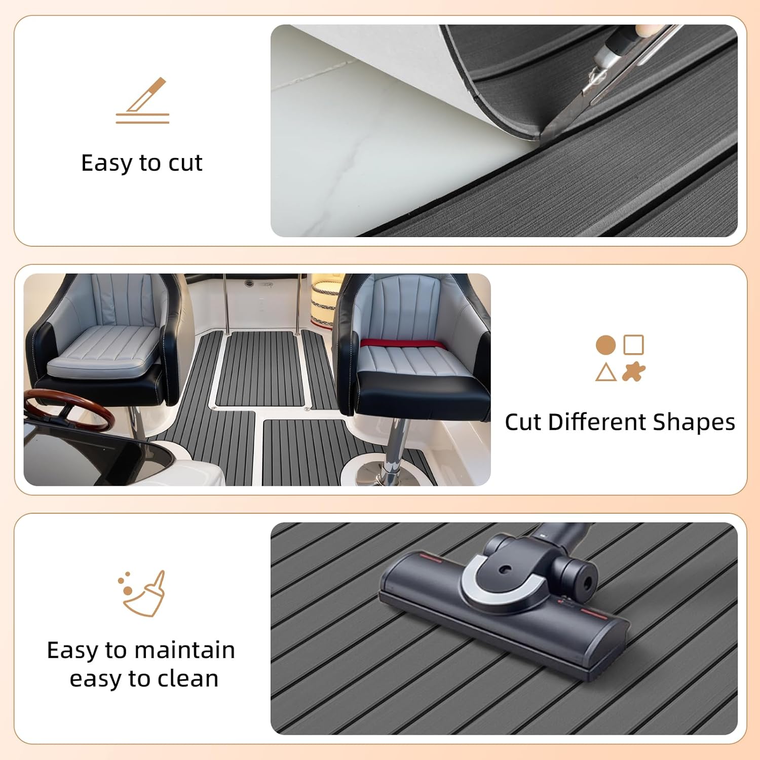 Boat Flooring EVA Foam Decking Sheet with 3M Adhesive BackingProduct Details: Type: EVA Foam Boat Decking Material: EVA Foam Thickness: 0.25" (6mm) Install Way: Self-Adhesive to floor Product Description: 1) Premium EVA Foam: Made from high quality EVA foam, has advantages of good cushioning, non-absorbent, non-skid, uv-resistance, shock absorption.2) High tensile elongation: Not easy deformation or damage.3) Safe Walking Pad: The U-groove can increase friction and play a good anti-skid, also good for drainage.4) Easy to Custom: Use scissors or a utility knife to cut the boat flooring eva foam into different shapes and sizes, you can enjoy DIY with marine flooring to fit the shape of your boat. 5) EVA Foam Boat Flooring with 3M Self Adhesive: Easy to install and stick it hard to the floor, have firm grip and easy to install. After you are installed this boat decking foam, please use strength to compaction that stick it hard to the floor.6) Wide Application: Can be used in boat flooring, yacht, fishing boat, motorboat, kayak deck, surfboard, SUP paddle board, swimming, cooler tops, golf cart, ramp, etc.7) Easy to Clean: Can be washed with broom, vacuum cleaner/pressure washed.8) Package: 1 EVA foam boat flooring, 1 x install instruction. Please Notice: 1. Please make sure the surface is clear, not dirty, no oil/wax/wet before install this product. 2. The colors may have difference due to various batch. 3. Due to the difference between different monitors setting, the picture may not reflect the actual color of the item. 4. Please don't put too heavy product on the foam for a long time, otherwise it will cause the sponge to be pressed and there is no way to restore the original.