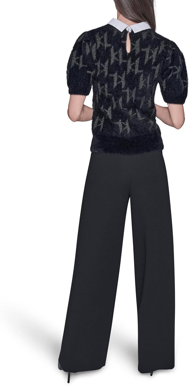 This Karl Lagerfeld Paris Women's Sweater is a Short Sleeve Collared Neck Puff Sleeve Logo Sweater