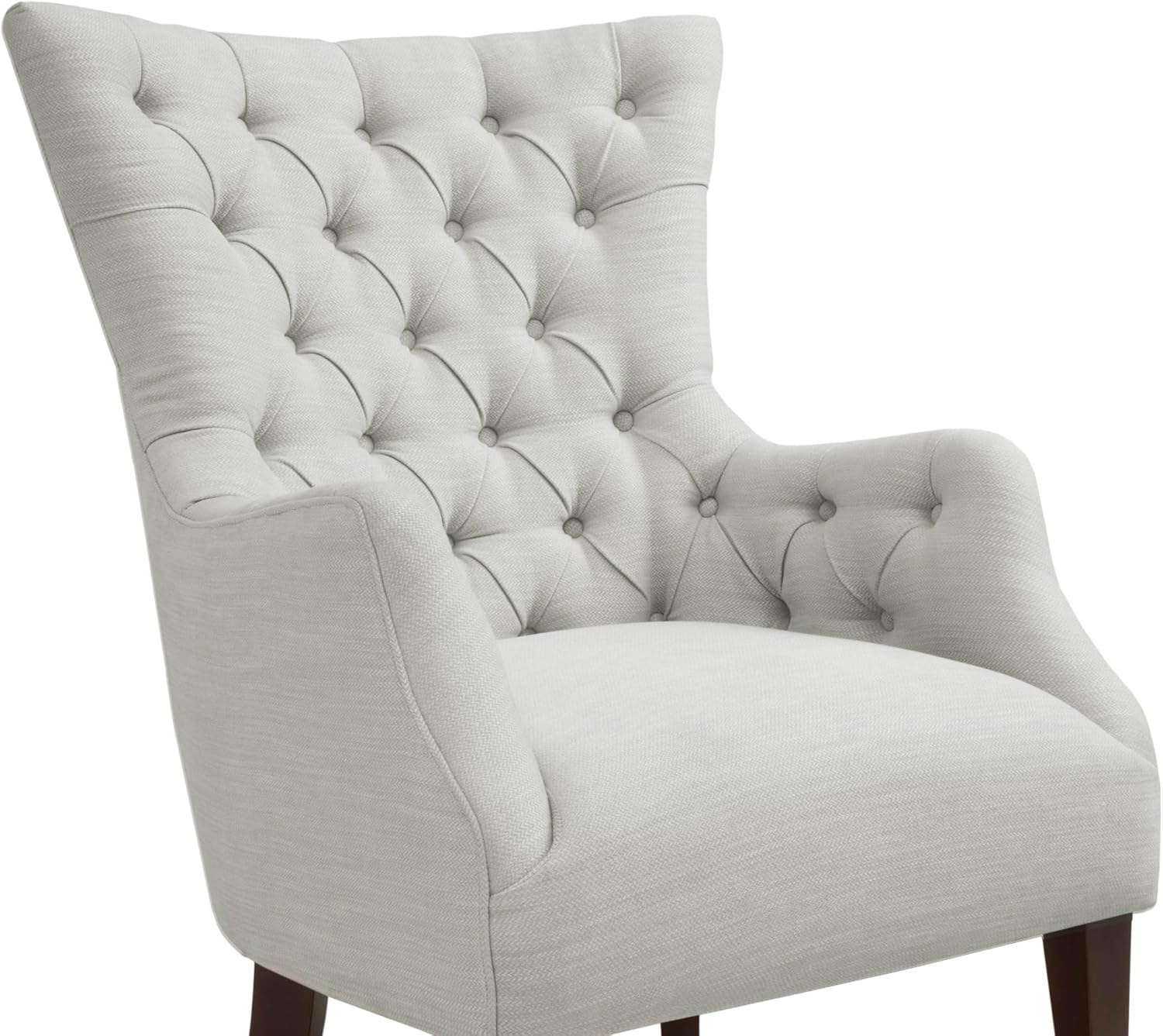 Grace your living room with the Lilith Button Tufted Wing Chair. Upholstered in a beautiful textured grey fabric, this herringbone wing back chair expresses elegance while displaying traditional elements like its button tufting and Charles of London arm mixed with contemporary styling. The tapered legs are composed of birch wood in an espresso finish. Leg assembly required.