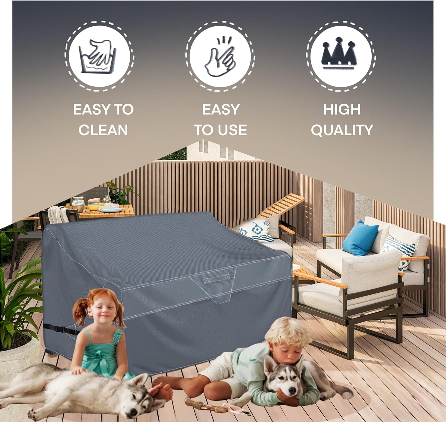 This outdoor sofa cover is designed for homeowners looking for a simple and reliable way to keep patio furniture covered when not in use. It helps shield sofas from common outdoor exposure such as dust, light moisture, fallen leaves, and sunlight. The breathable vent supports air circulation while the cover is in place, helping maintain a more balanced internal environment. The adjustable fastening system allows the cover to better conform to the shape of the furniture. Finished in a neutral grey tone with a clean white accent line, this patio couch cover combines functionality with a neat appearance suitable for patios, decks, balconies, and garden seating areas