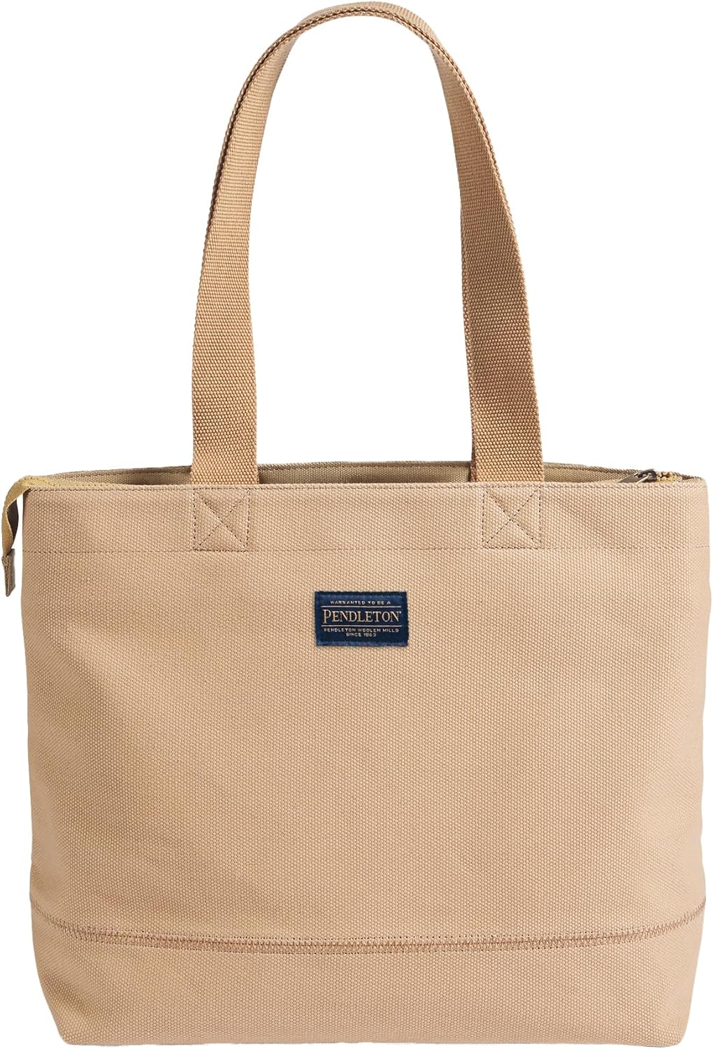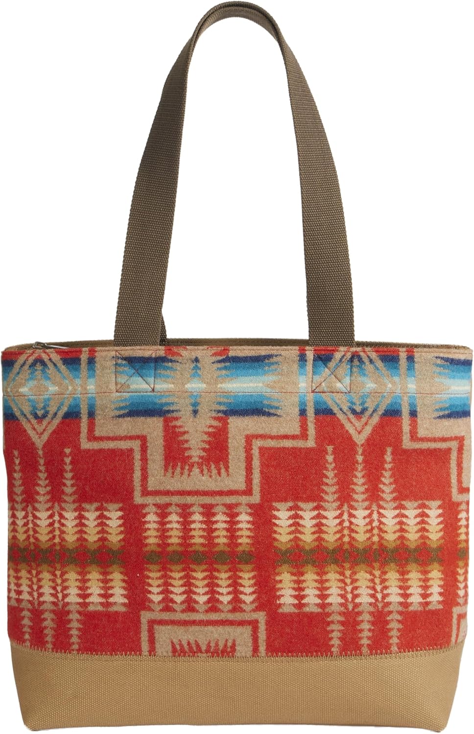 Discover the perfect blend of heritage craftsmanship and modern functionality with this Pendleton City Tote featuring the iconic Harding pattern in vibrant turquoise. The spacious design, measuring 14 inches wide, 12½ inches high, and 6 inches deep, offers ample room for your daily essentials. The bag showcases a stunning 100% virgin wool exterior, woven in American mills, complemented by durable cotton canvas trim and lining. Practical features include interior slip pockets for organization and comfortable 11-inch handle drops for easy carrying. The classic tote silhouette is enhanced with a secure zip closure, while the striking geometric pattern in turquoise, tan, and warm accent colors adds a distinctive Southwestern flair. Each bag may feature unique pattern placement, making yours one of a kind. The combination of premium materials and timeless design makes this tote an ideal companion for both everyday use and travel.
