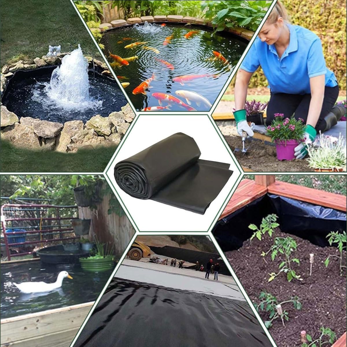 The most important function of an HDPE liner is to prevent water from leaking out of the pond. It is often used in aquaculture, fish pond farming, and as a seepage barrier for technical housing, etc. It not only has good weather resistance, but is also non-toxic and harmless to animals and plants, and has no adverse effects on the aquatic ecosystem, ensuring your pond maintains a healthy ecological balance.SpecificationName: Impermeable Pond LinerMaterial: High-Density Polyethylene (HDPE)Color: BlackThickness: 0.3mm by default --- Customization SupportedSize: Any size can be customizedPackage includes:1 x Pond LinerNotes:1. Due to manual measurement, 2-3cm deviation is allowed.2. Different monitors have different calls, and the product color is subject to the actual product.