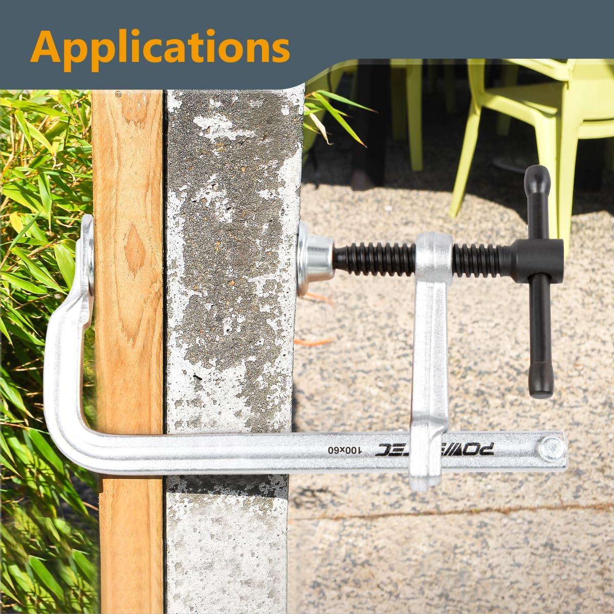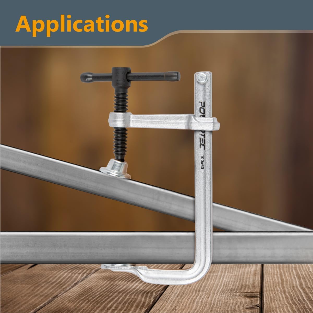 Introducing the 4-Inch x 2-3/8-Inch Throat F Clamp by POWERTEC.This hold down clamp is intended to provide you with a versatile clamping tool for an extended range of general purpose workshop task.Clearly named for it’s shape, this f-style clamp is the perfect complement to glue based or screw down woodworking and household projects – offering support and/or a heavy duty clamping force to hold materials together while you make repairs or changes.They offer a simplistic, easy to use design that is practical for both the professional or DIY enthusiast.They’re the perfect little tool for big projects. Premium Design Each clamp features a lightweight profile, with a strong and durable construction with your needs in mind.The all-steel arm provides a strong hold with a maximal clamping capacity of 480 lbs.The swivel seamlessly centers on your stock for a sturdy hold. And for your added comfort, this clamping tool was designed with an ergonomic 1-7/8” t-handle that allows you to apply extra force when tightening.SpecificationsMaximal Opening: 4-3/16”Throat Depth: 2-3/8”Smooth Edge: .45” wide x .22” thickClamping Capacity: 480 lbsClamping Arm Material: Steel Package