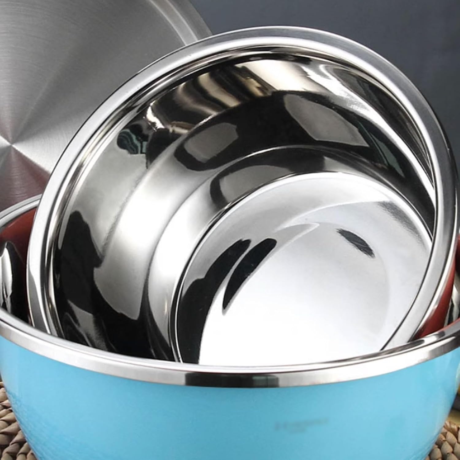 Convenient for storing and carrying food.Material: Stainless steelSize: 20cmx8.9cm/7.8x3.5in22cmx9.3cm/8.6x3.6in24cmx10.3cm/9.4x4.0inCapacity: 2100ml/73.9oz,2800ml/98.5oz,3500ml/123.1ozColor: blue, yellow, redScope of application: home, kitchen, restaurant, hotel, etc.Packing list: only includes Stainless steel mixing bowl with lid x1 (excluding other items shown in the picture)Kind tips1. Due to the difference in light and display, the color of the picture may be slightly different from the actual object, please refer to the actual object.2. The size is measured manually. If there is a slight error, please refer to the actual product received.3. Please wipe it clean immediately after use.4. For stainless steel products, please avoid scrubbing with hard objects such as steel wool.5. Stainless steel products may have slight wear and scratches on the surface, which will not affect the use.6. Suitable for heating on induction cooker.The nestable design saves space and makes it easy to store in shelves or cabinets.