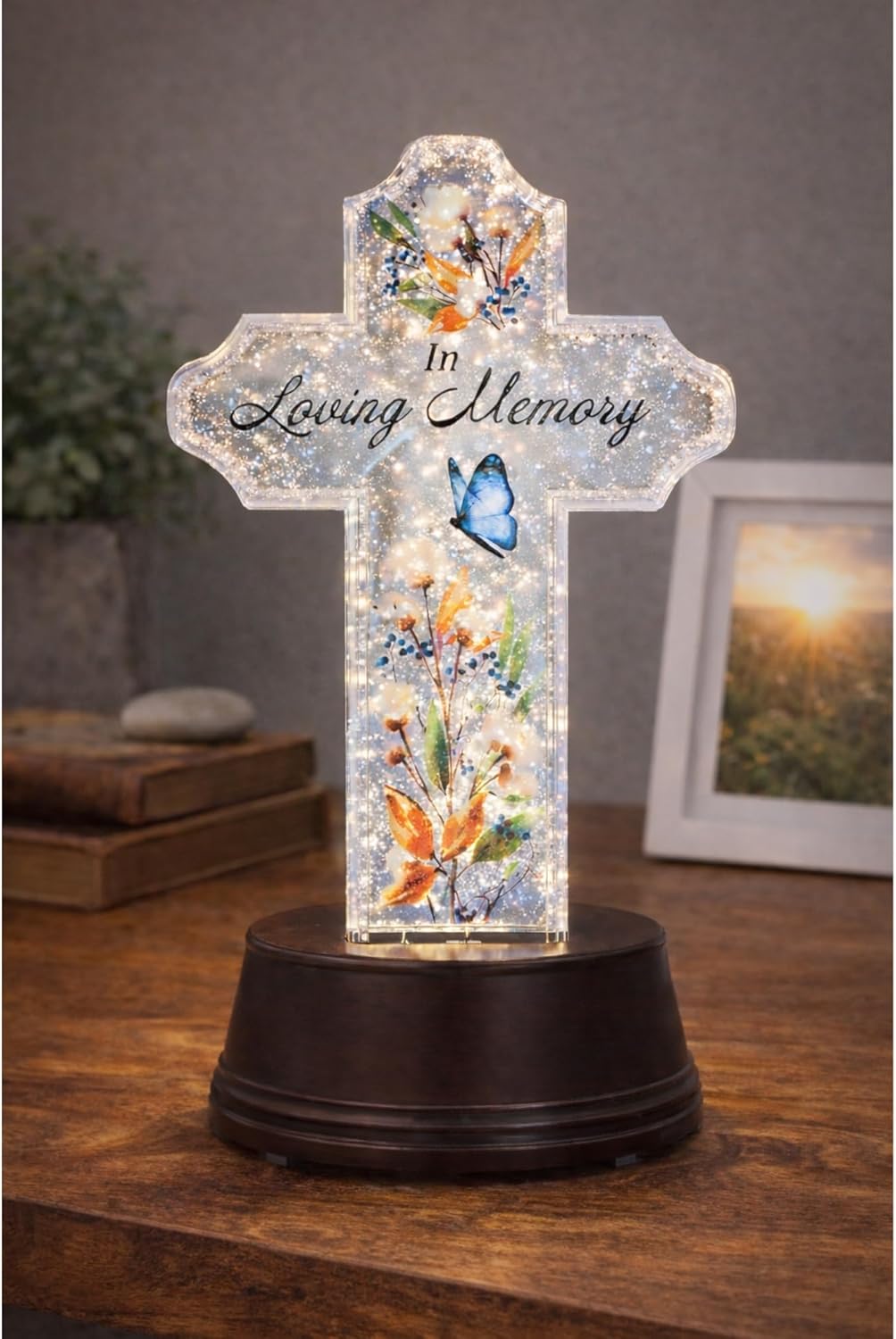 The Bridge Collection Cross Memorial Water Glitter Lantern offers a peaceful and faith-inspired way to honor the memory of someone special. Designed in a meaningful cross shape with delicate floral accents, this memorial lantern creates a comforting tribute that reflects faith, remembrance, and love. The water-filled design features sparkling glitter that gently swirls when illuminated, creating a calming visual display. A built-in LED light softly illuminates the lantern, casting a warm glow that enhances the reflective atmosphere. The integrated circulator keeps the glitter continuously moving without the need for shaking, while the automatic timer allows the lantern to operate on a convenient 6-hour on and 18-hour off cycle. Crafted from durable polyresin, this lantern is designed to serve as a lasting memorial keepsake. Whether placed on a shelf, mantel, bedside table, or remembrance display, it offers a meaningful way to honor cherished memories and provide comfort during times of reflection.