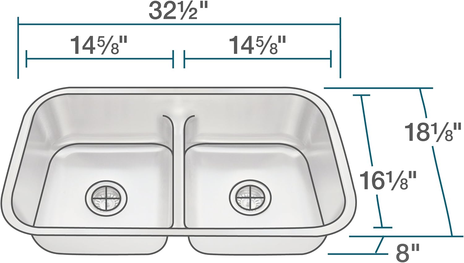 What makes the equal-sized, double-bowl sink of the P215 Kitchen Ensemble special is the low divide between the bowls. Recessed by 3½-inches, the lower division allows pot handles to hang over, or large baking pans to be submerged. Also, the 14 5/8'' x 16 1/8'' bowls are manufactured with centered drains. This sink is constructed of premium 304-grade stainless steel, 16-gauge, and comes with the Polaris limited lifetime warranty. The full ensemble includes a pair of standard strainers to catch food scraps, a pair of grids to keep items above the sink base, and a beautiful light-color wood cutting board. Either a flush or positive reveal is required when installing this undermount sink. A negative reveal will not accommodate the custom-fitted cutting board.
