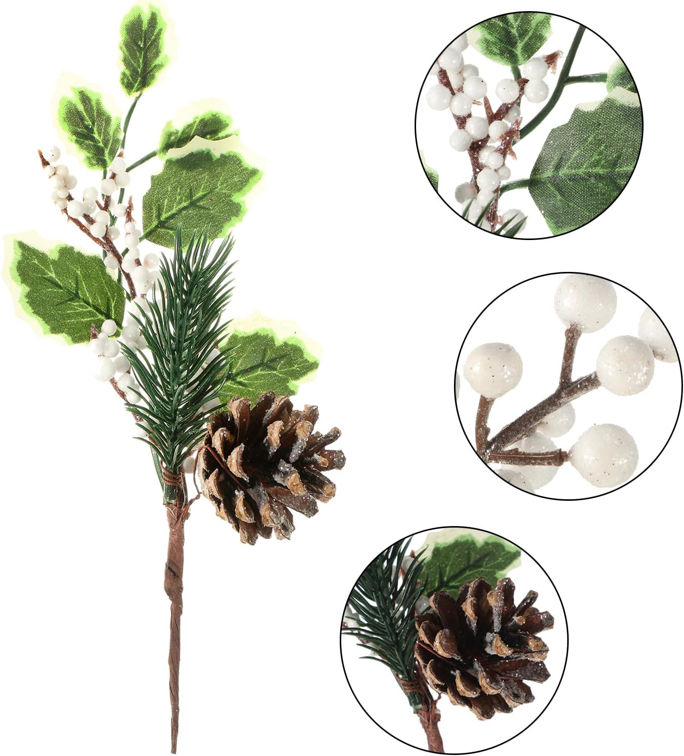 Feature Product feature: These Christmas picks are made of snowy pine cones, green holly leaves, burlap ribbon, etc., and each is attached firmly to a flexible craft stick, nice for gift embellishments or holiday craft projects. Creating Christmas atmosphere: These holly berry picks are suitable for Christmas floral arrangements, DIY wreath design, indoor lanterns or baskets decorations, adding them to your Christmas tree to create a Christmas atmosphere. Specifications: Size: 8 inch Style: green, white Quantity: 24 pieces, 3 pieces each style Package includes: 24 x Artificial Christmas picks