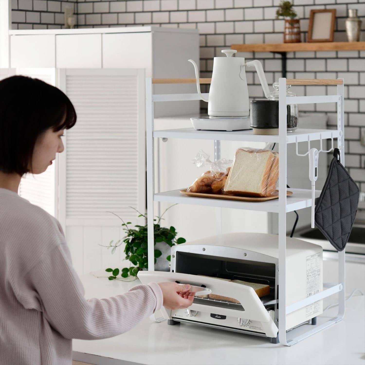 Can be used to store vertical dead spaces Yamazen DRR-732 Design Expandable Kitchen 2-Tier Rack (Extendable Width) The width can be stretched from 18.1 to 28.7 inches (46 to 73 cm), so you can adjust the width depending on the size of the microwave or toaster or the width of the place you store. (Height of Shelves) The height of the shelf board can be adjusted to 15 increments of 0.8 inch (2 cm) pitch, so you can adjust it to suit the items you want to store. (Plenty of storage) 2 shelves allow you to store plenty of items. Can be used as storage space on the stove. Hooks: There are hooks on the side for convenient hanging of trivets and mittens. Product Size: Width 18.1 - 28.7 x Depth 14.0 x Height 27.6 inches (46 - 73 x 3Total Load Capacity: 22.0 lbs (10 kg) (11.0 lbs (5 kg) per shelf) Handle handle inner dimensions: 15.7 - 26.4 inches (40 - 67 cm) Top board interior dimensions: Width 16.1 - 26.8 x Depth 13.6 inches (41 - 68 x 34.5 cm) Top plate height (both top and bottom): Minimum 14.4 - Maximum 25.4 inches (36.5 - 64.5 cm) (0.8 inch (2 cm) pitch 15 levels). Inner Dimensions: Height of lower top plate - 0.8 inches (2 cm) Assembly required All products handled by TOD Prime Co., Ltd. have passed testing according to JIS standards by third-party agencies in Japan.